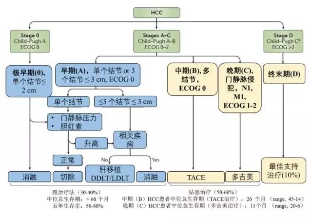 肝癌的治疗根据分期而不同,生存期也有明显差异。依据巴塞罗那分期标准(图1)[2],早期肝癌患者通过消融、切除或肝移植等可能达到根治,因此生存期相对较长,而中晚期和终末期患者已经丧失了根治机会,以经导管动脉化学栓塞(TACE)等介入治疗、靶向药物治疗或最佳支持治疗为主,生存期相对较短。