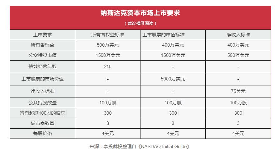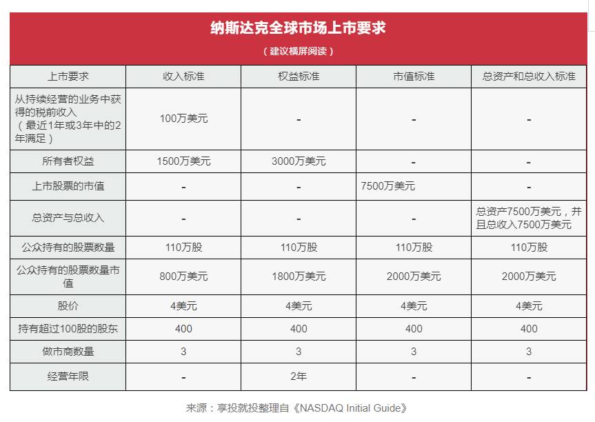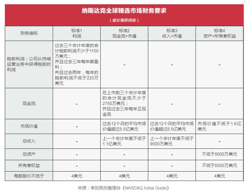 这是纳斯达克最高级别层次的上市要求,不拘泥于收入和利润。有四个标准,只要符合其中一个标准就可以申请IPO。