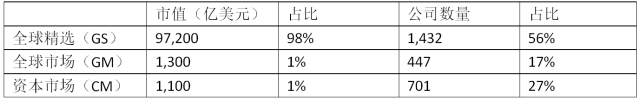 从这个统计表也可以看出,纳斯达克是全球精选层公司数量只占56%,但是市值却占到了98%之多。从市值上看,全球市场层,和资本市场层,可以忽略不计。
