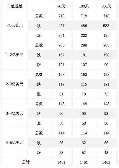 上面的表格,分别统计了5亿以下每一个市值区间的上市公司,在上市后90天、180天(通常大股东的锁定期限)、360天的股价涨跌情况。