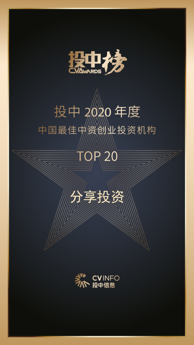 2021年5月13日,投中信息重磅发布了2020年中国创业投资机构暨私募股权投资系列榜单——“投中榜”。分享投资荣膺「2020年度中国最佳创业投资机构TOP50」,位列32名;荣膺「2020年度中国最佳中资创业投资机构TOP20」,位列16名。